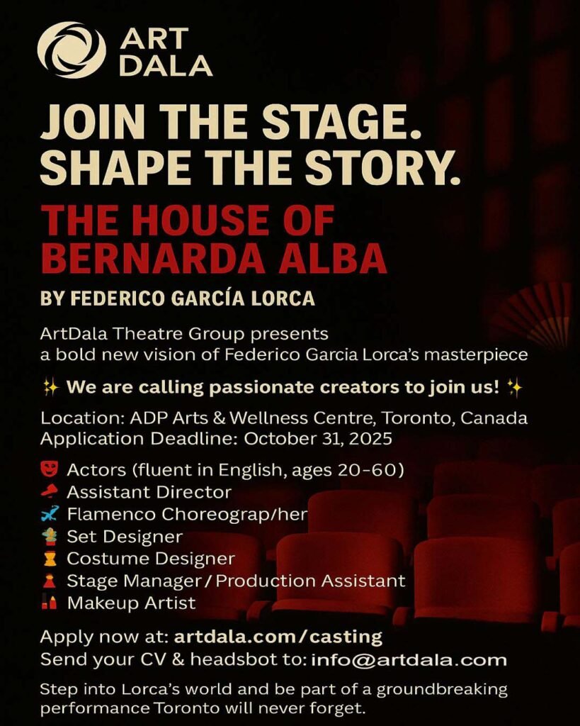 The ADP Centre and Art Dala Theatre Group are seeking passionate and skilled individuals for our Spring 2026 production of The House of Bernarda Alba, to be staged in Toronto, Montreal, and Ottawa.